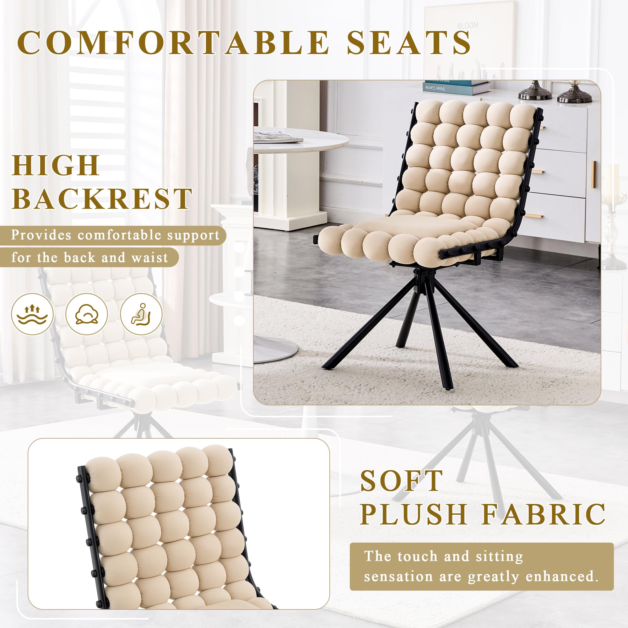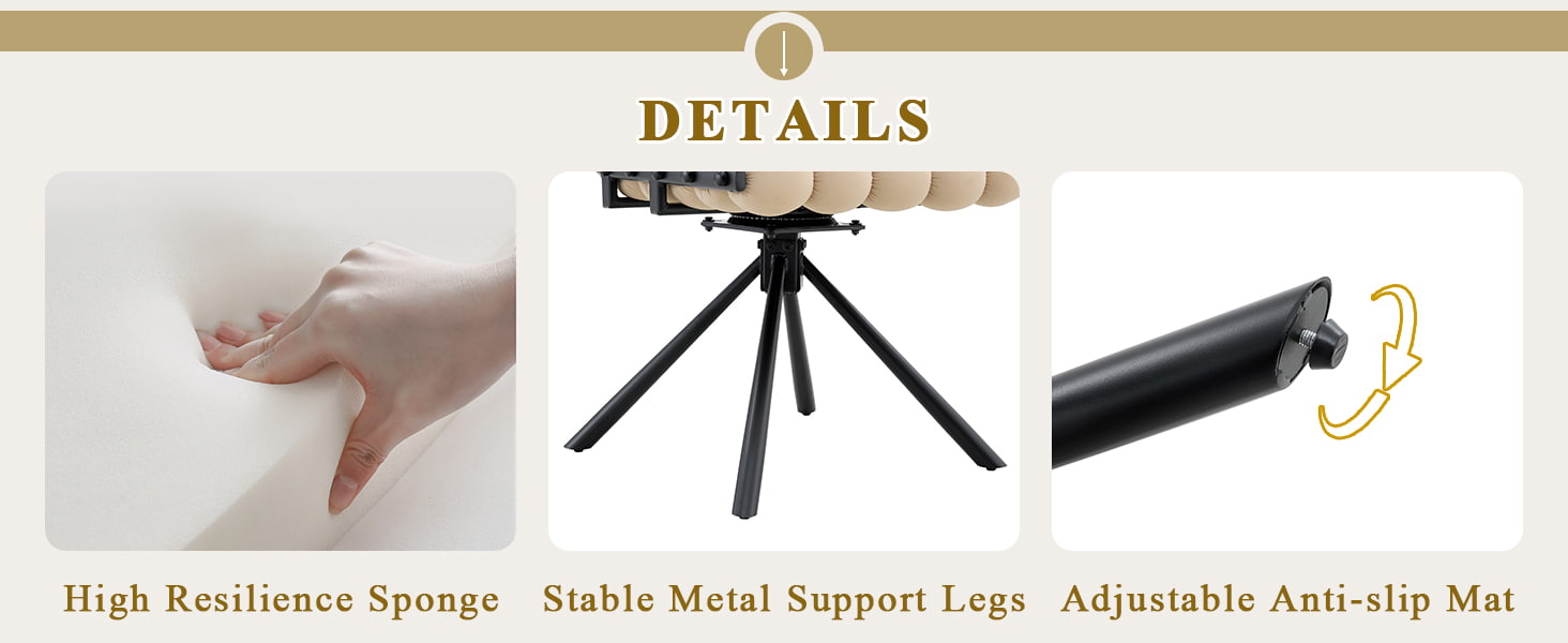 Haec sella holoserica verticuli designatur ad spatia triclinii moderni, interiora vivendi, et ambitus commerciales boutique. Aliquam pulvinari sculpturae bullae tergum et holosericum Hollandum holosericum laeve, sella consilium oculorum captans cum cotidiana consolatione coniungit. Circulus 360 functio gradus flexibiles motus permittit, dum crura metallica valida et basis nulla rota certam stabilitatem praebent in tricliniis, cellis vivis, locis rutrum, et cafe sessio. Eius ergonomic recurvum et altum mollitiam spongiae cusiculi adiutorium corporis pressionem aequaliter distribuit, praebens subsidium commodioris in sedendo extenso.