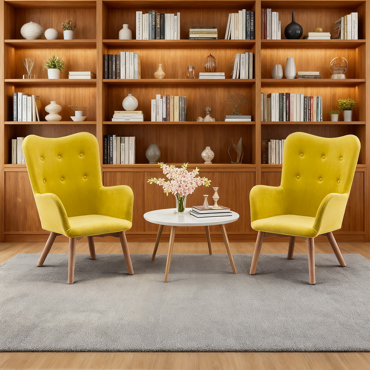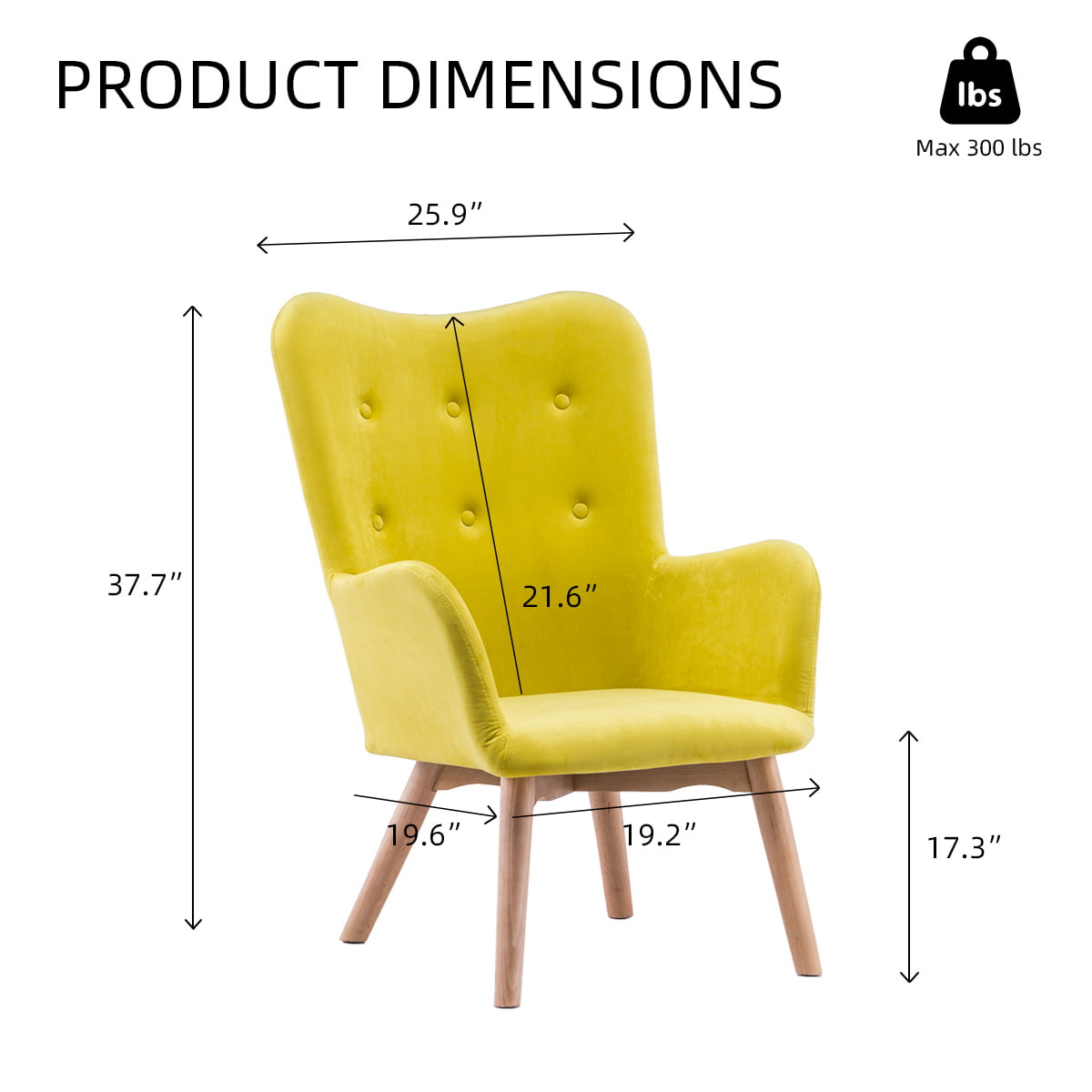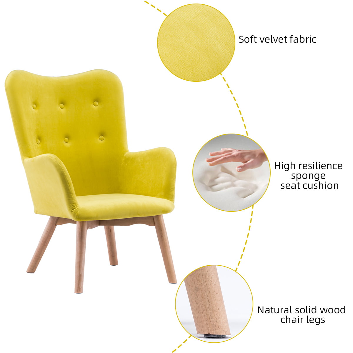 Modern Yellow Velvet Accent Armchair — Wingback Tufted Otium Cathedrae cum cruribus ligneis & Armrests pro sessoria, cubiculo, vel officio