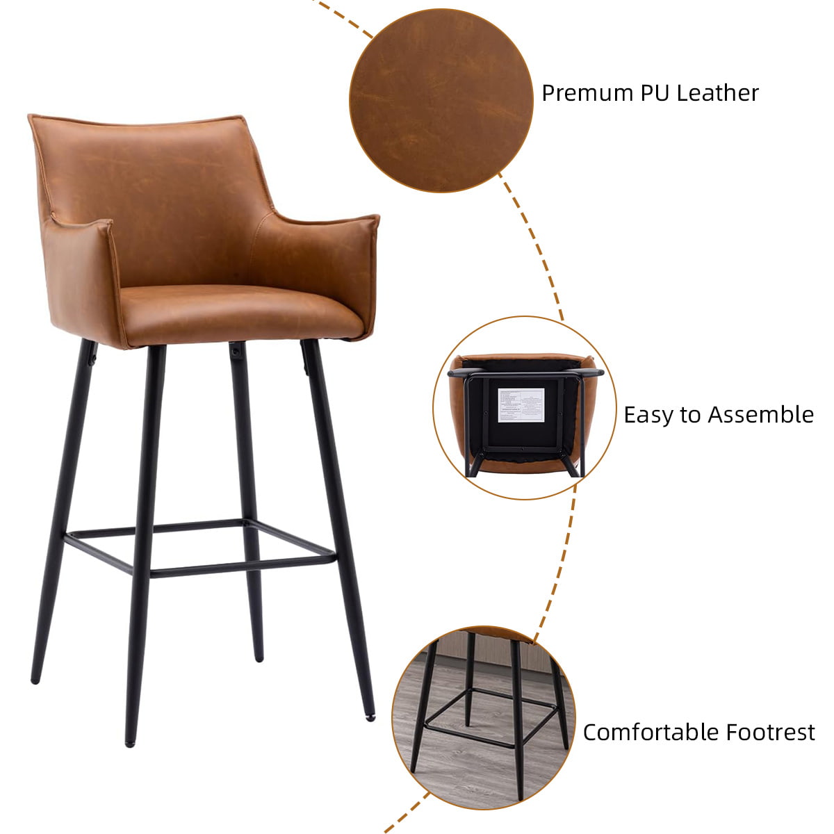Modern Brown PU Leather Bar Stool with Armrests & Backrest — Counter Height Upholstered Bar Cathir with Black Metal legs for Kitchen Island, Bistro, or Home Bar